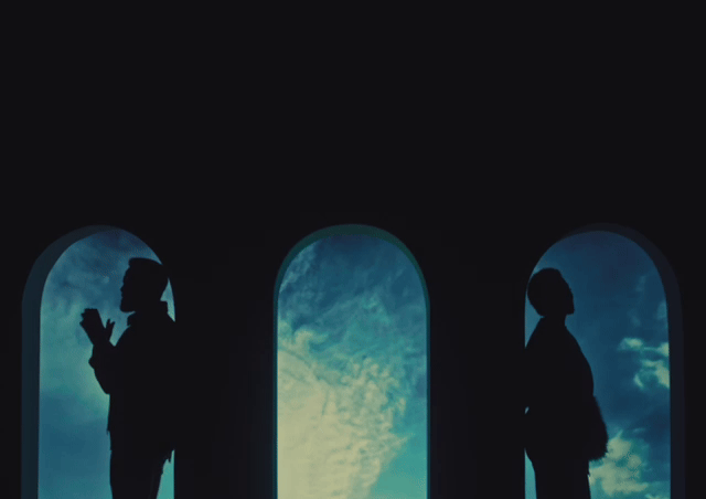 Silhouettes of two people standing in front of arched windows with a cloudy sky background