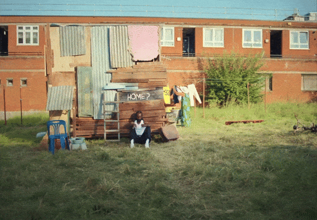 Person sitting on the ground in front of a makeshift home made from wood and metal sheets, with laundry hanging outside and a small tree nearby in an urban area.