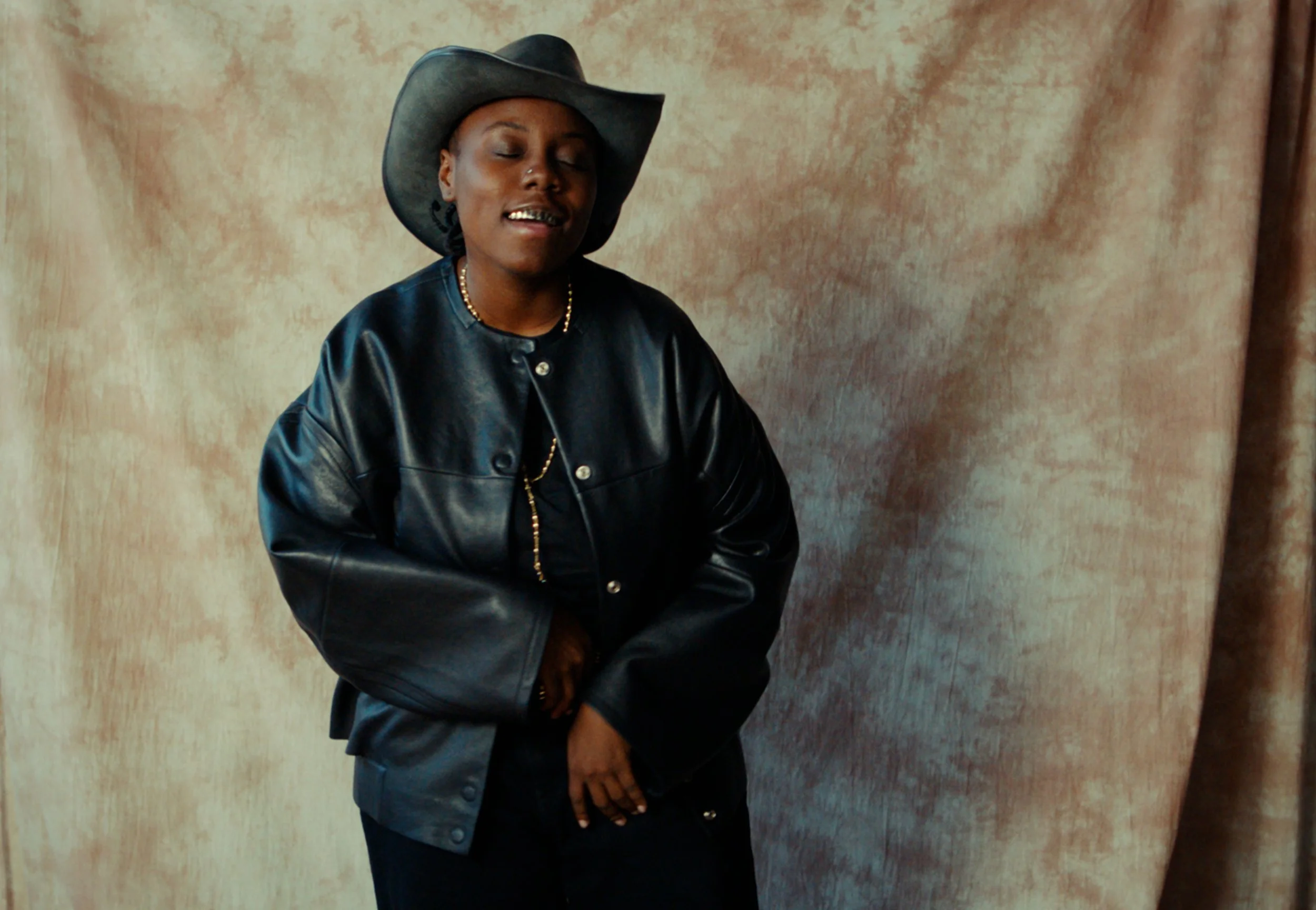 Woman wearing a black leather jacket and a wide-brimmed hat, standing with her eyes closed and smiling in front of a beige textured background.
