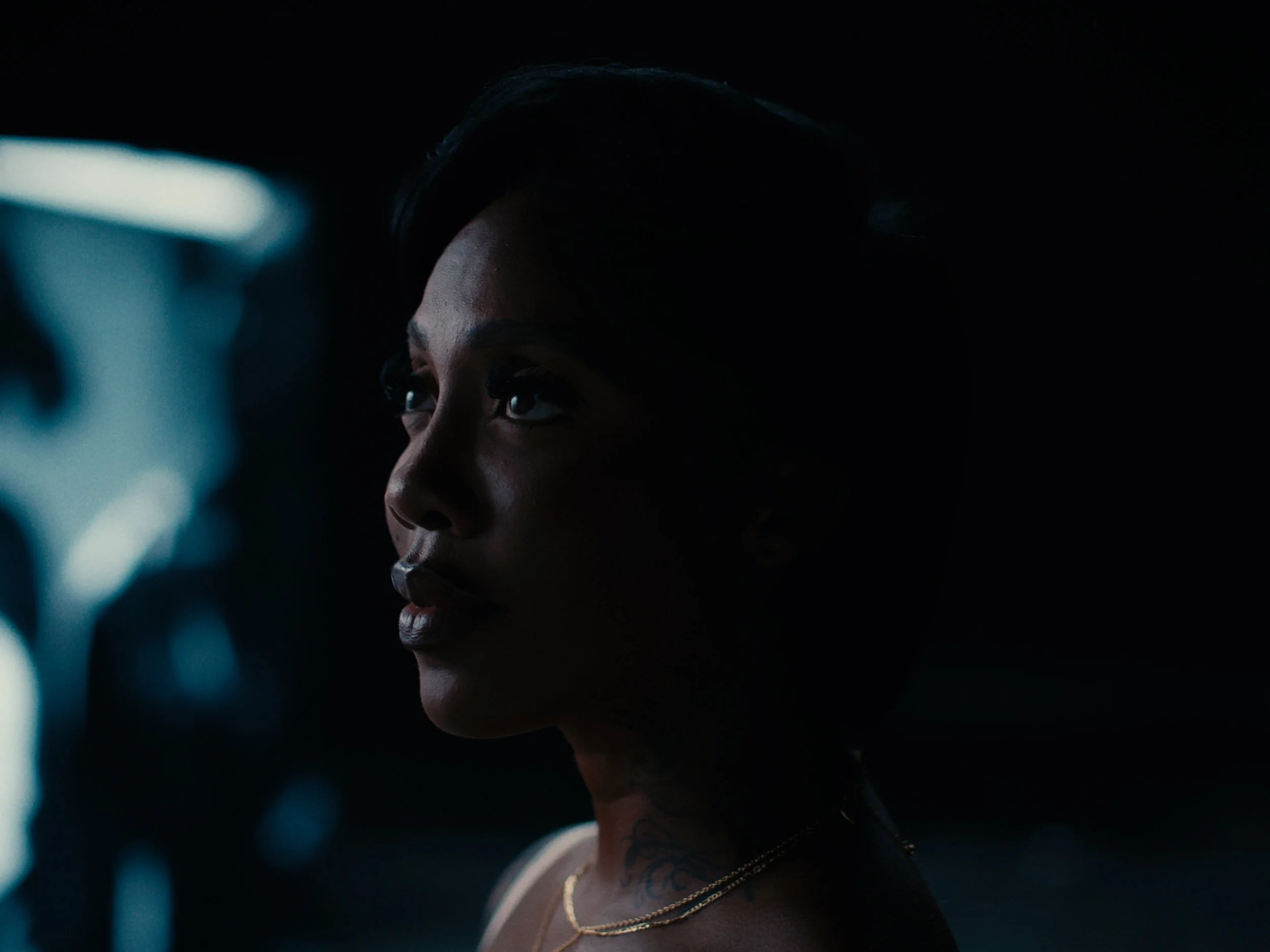 A woman with dark hair and earrings looking sideways in a dark setting with some blue light illuminating her face.