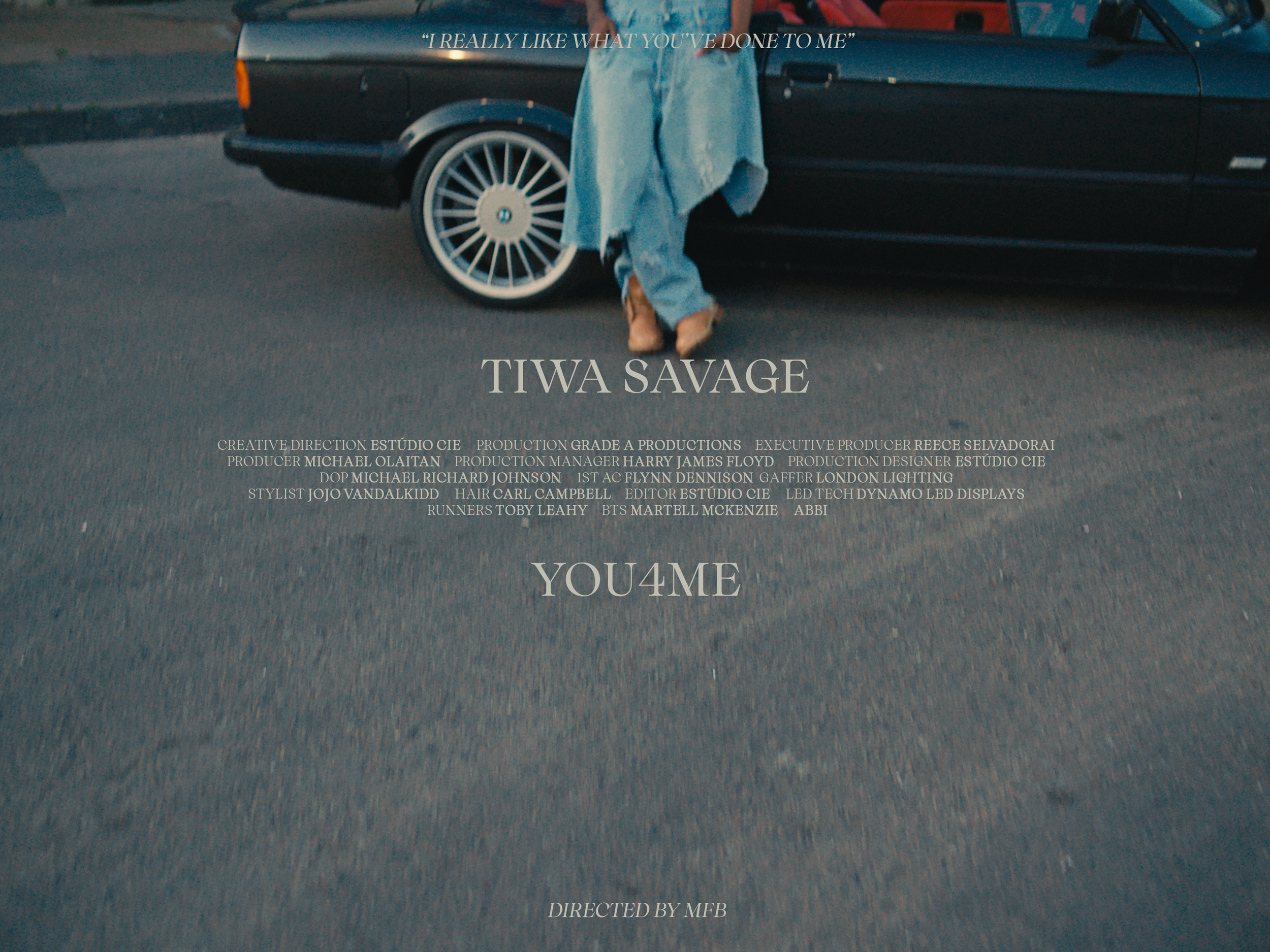 A person standing next to a black vintage car wearing blue jeans and a curly coat, with the cars parked on the street. Overlaid text includes song lyrics, the name TIWA SAVAGE, and production credits.