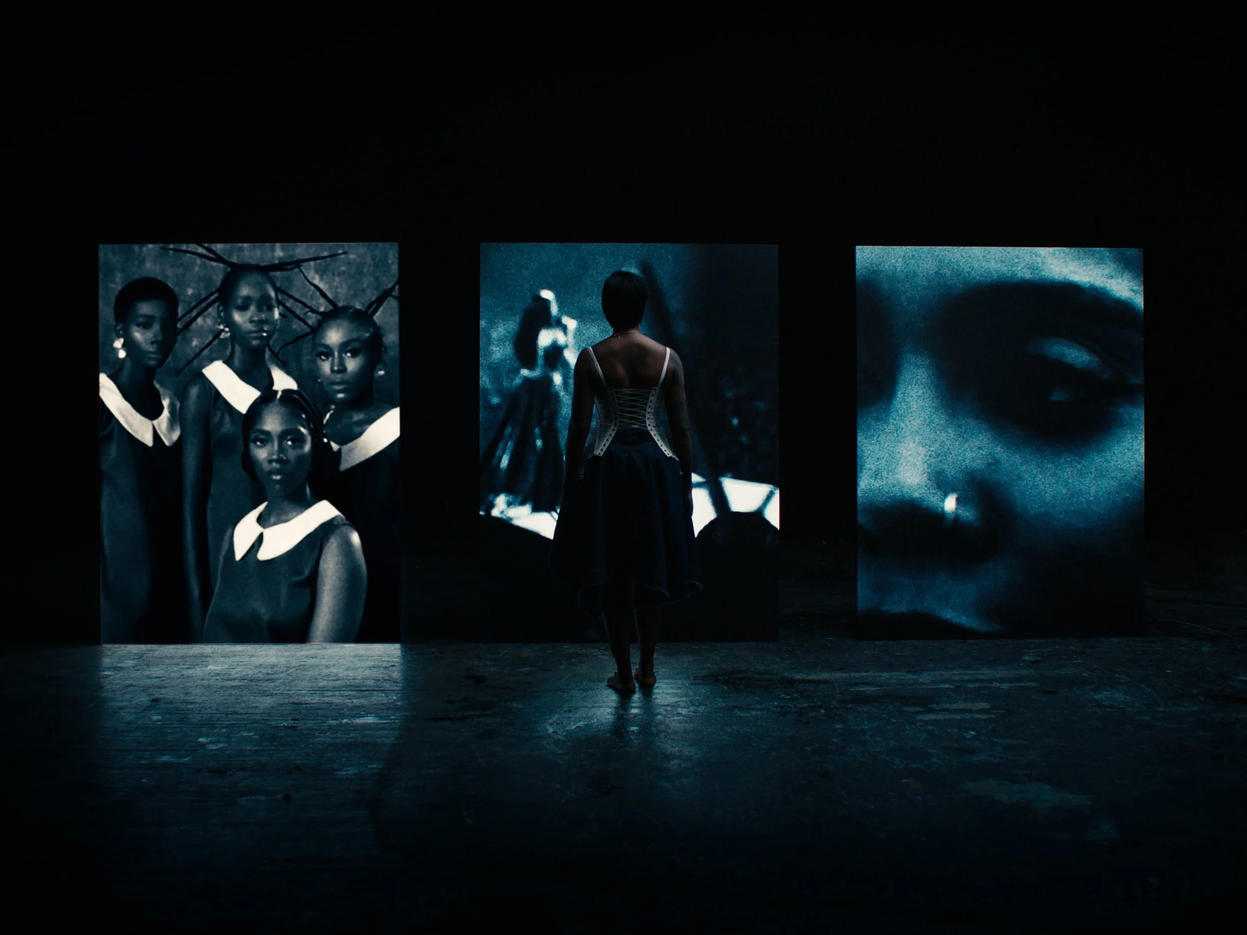 A person standing in front of three large digital screens displaying black and white images of women. The central screen shows a woman in on a bridge, and the right screen displays a close-up of a woman's face.