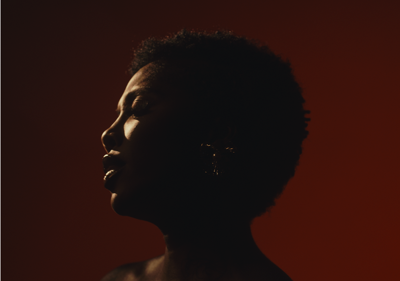 Profile of a woman with closed eyes, illuminated softly, with curly short hair and hoop earrings, against a dark background with warm reddish tones.