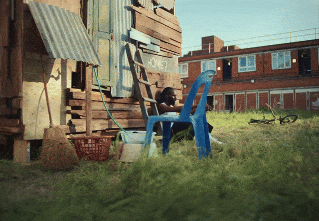 Child sitting in a blue plastic chair outside a makeshift shack in a grassy area, with a bicycle lying on the ground nearby and an apartment building in the background.