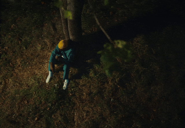 A person wearing a yellow hat and teal outfit sitting on the ground in a dark outdoor setting, with trees and foliage nearby.