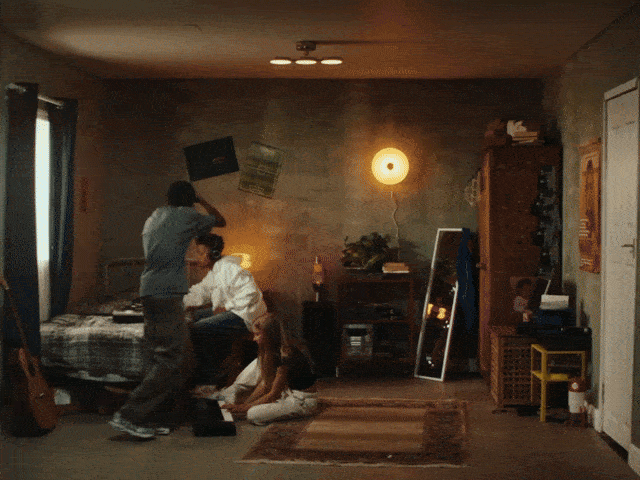 Two children in a dimly lit bedroom, one is sitting on the bed and the other is standing nearby. There is a mirror propped against the wall, a small yellow chair, a wooden cabinet, and various personal items scattered around.