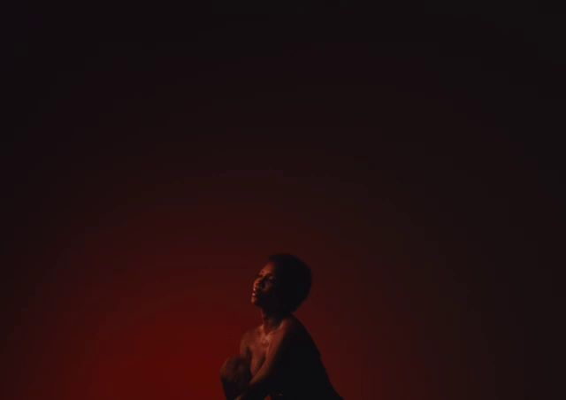 A person with curly hair and a bare chest standing in front of a dark background with a reddish glow.